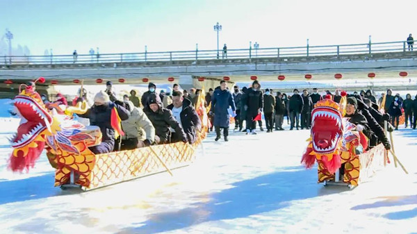 伴随着清脆的鼓点和喊起的号子,冰上龙舟比赛参赛队伍齐发,如离弦之箭冲向终点,队员们动作整齐地奋力划桨,在冰面上你追我赶,激情高涨。比赛的热情感染着现场的观众,纷纷为参赛队伍加油助威。色彩绚丽的龙舟,是元宵佳节的祝福,是民俗文化的传承,凸显了浓厚热烈的喜庆氛围。