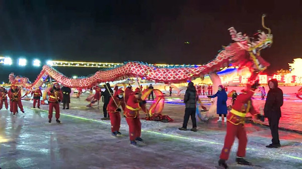 夜幕降临,“百姓大舞台”文艺演出在乌马河冰雪童话乐园火热上演,冰面上的舞龙表演,更是将整场演出推向高潮,伴着中国风的乐曲,表演者们脚踩冰刀,手举长龙,随着音乐在冰面上穿梭、滑行,引得观众们喝彩连连。演出中场还设置了猜灯谜互动游戏,趣味十足,猜中谜底的观众获得小礼品,获得了属于元宵节的小幸运。