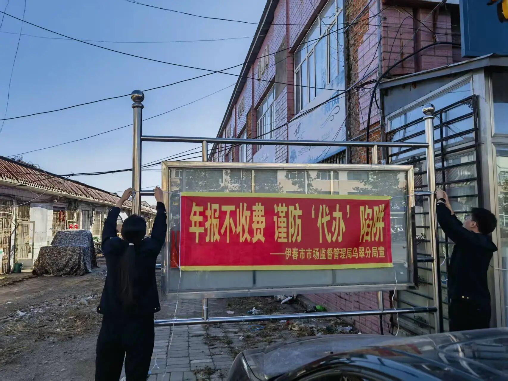 线下条幅亮底线,直观警示入人心。聚焦乌马河镇、翠峦镇等人流密集区域,精准悬挂“年报不收费,谨防‘代办’陷阱”条幅,时刻提醒过往企业经营者和群众任何以“补报年报”“信用修复”为由收取费用的行为,均可能是诈骗。通过直观、易懂的方式,让企业在日常经营活动中随时能看到、记在心,时刻绷紧“防骗弦”。